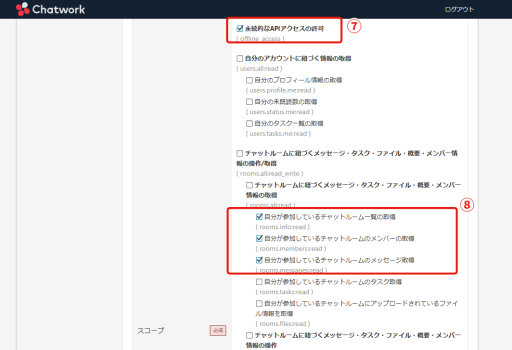 ⑧「自分が参加しているチャットルーム一覧の取得」「自分が参加しているチャットルームのメンバーの取得」「自分か参加しているチャットルームのメッセージ取得」の3箇所にチェック