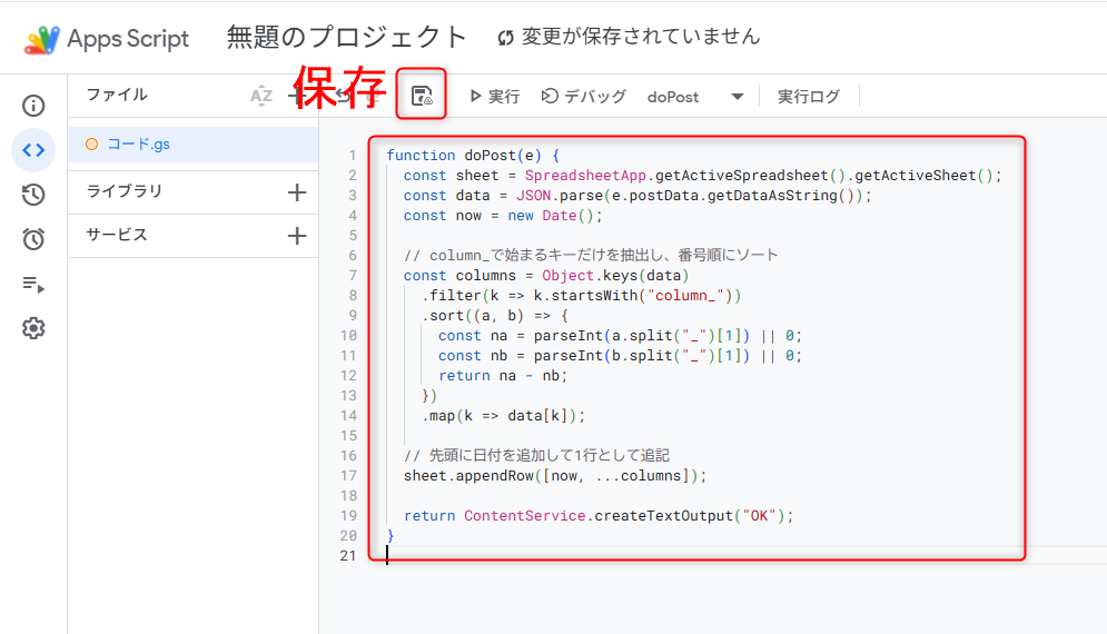 ↓ ② Apps Script設定 スプレッドシートへ書き込む処理は、それ以降の「doPost()」に設定します。 下記コードをコピペし保存します。 記入されたスプレッドシートの最後の行に追加されます。