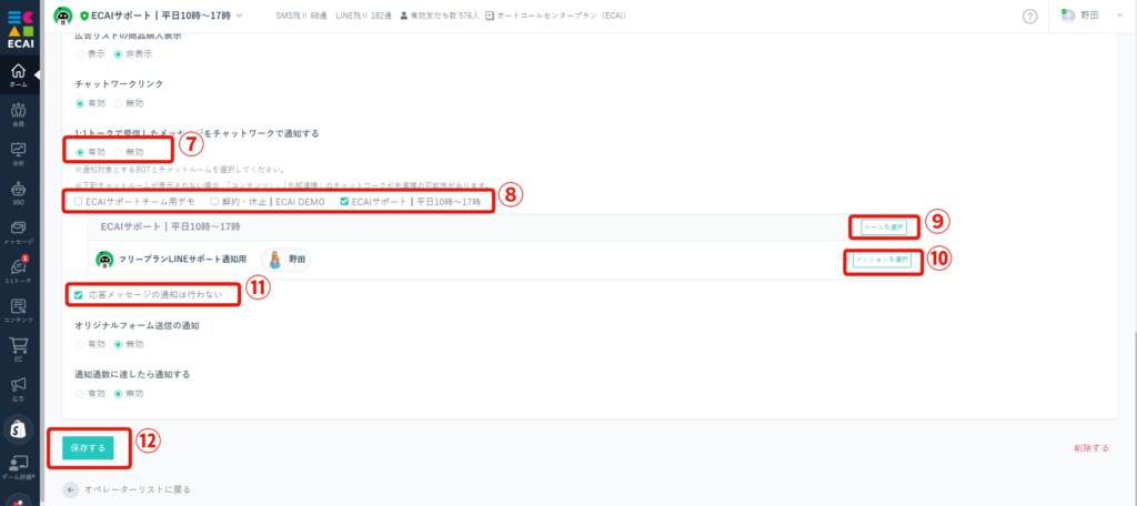 ⑦1:1トークで受信したメッセージをチャットワーク通知するを「有効」